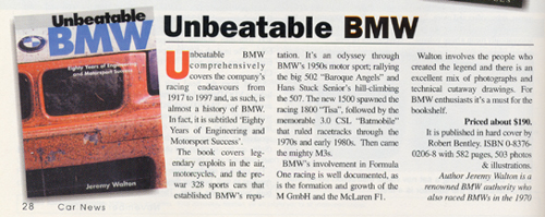 Unbeatable BMW comprehensively covers the company's racing endeavours from 1917 to 1997 and, as such, is almost a history of BMW. In fact, it is subtitled 'Eighty Years of Engineering and Motorsport Success'.